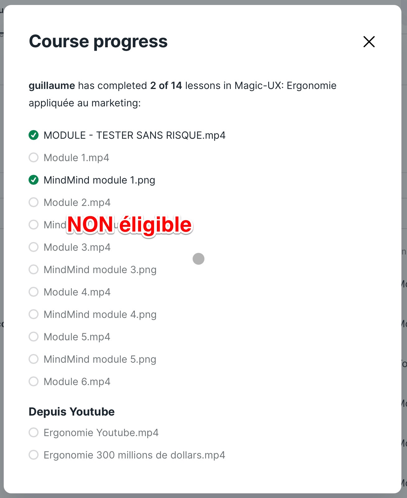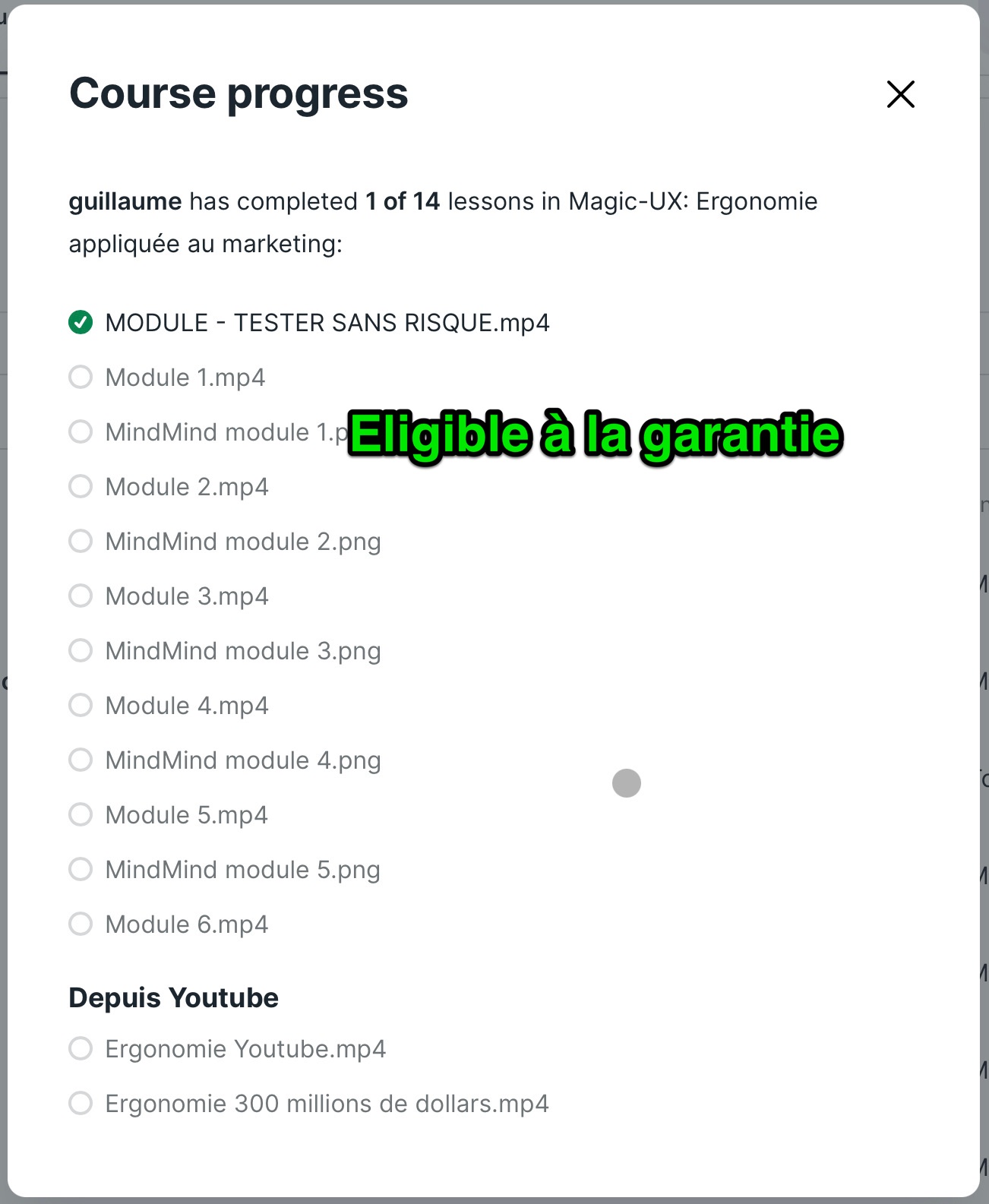 Notre équipe vérifiera que vous avez suivi seulement le module “MODULE - TESTER SANS RISQUE”. (et que vous n’avez pas cliqué sur les autres).